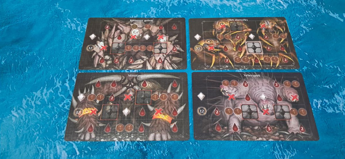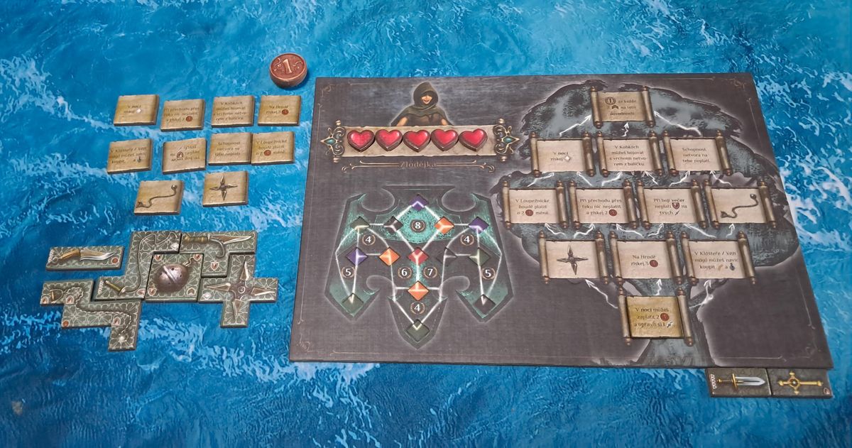 Jakmile vás pak opět omrzí boj, zamířit jde též do vesnice, loupežnické boudy, kláštera nabízejícího lektvary nebo do věže mágů. Pokud vás zajímá, jak tu probíhá boj, je to překvapivě prosté. Před jeho začátkem si musíte vybrat dva žetony zbraní, které použijete, načež po odhalení netvora můžete sáhnout ještě po lektvarech či kouzlech, jež reálně navyšují šanci na úspěch. Co je pak vaším úkolem v této bitvě? Nehrajete tu karty ani neházíte kostkami, nýbrž s dostupnými žetony musíte zakrýt všechny body s rudým křížkem. Zbraně a jiné předměty se pak nemohou překrývat ani nesmí být umístěny diagonálně či překrývat bod jen částečně. Zakrýt je pak nutné nejen křížky, nýbrž také kapky krve, jelikož ty vedou k úbytku životů.
