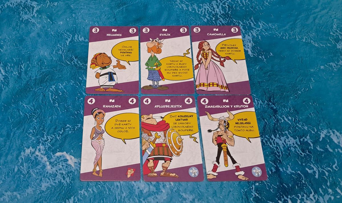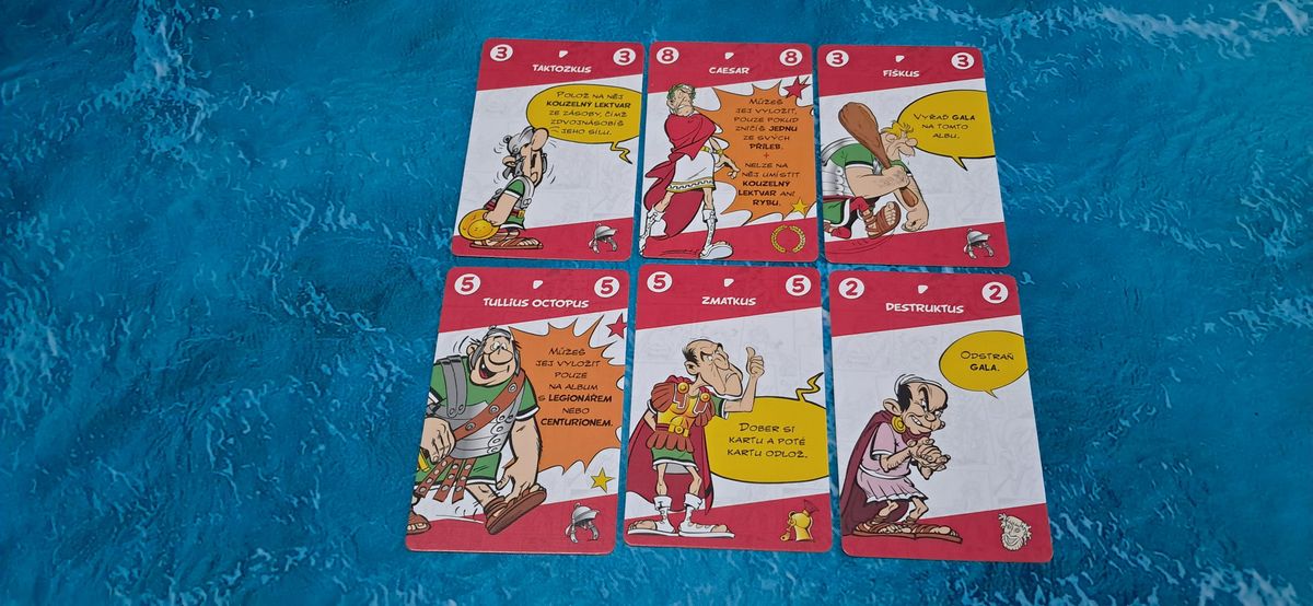 Zbytek karet, a že jich není málo, pak míří na dobírací hromádku, přičemž mezi hráči jsou startovní karty alb. Jak fungují ta? Prakticky slouží jako prostor, do něhož vykládáte karty. Jakým způsobem? Prakticky je tu definováno, že postavy pokládáte dle toho, k jaké barvě patří. Galové míří k modré straně alba a Římané k červené, zatímco zástupce neutrálních frakcí jde vyložit dle libosti. Vybrané postavičky pak žádají splnění určitých podmínek, což je třeba příklad Kleopatry, která odmítá přijít na scénu v případě, že neodložíte dvě karty, za tento krok je vás ale ochotna odměnit sedmi body síly. Pokud jde pak o jednotlivé hrdiny, ti mají unikátní schopnosti, s nimiž během partie pracují.