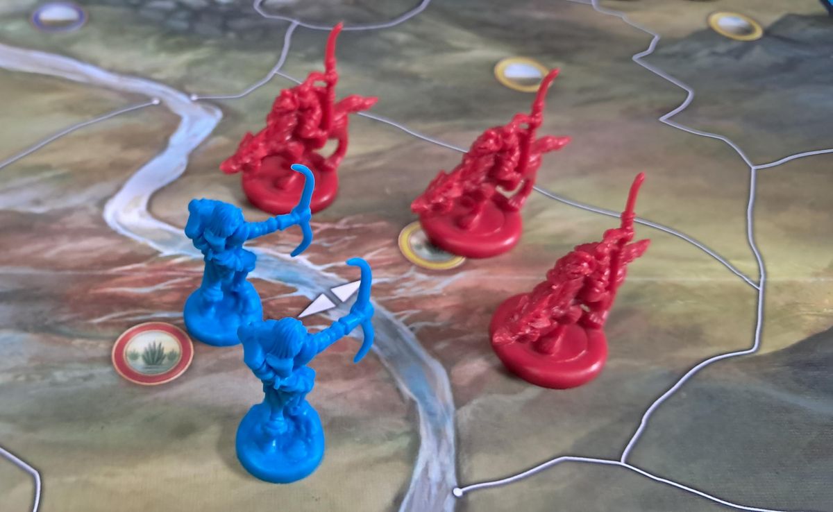 Zlo pak na mapu teprve víceméně míří, jelikož takřka všechny jeho jednotky startují v pravém horním rohu, z něhož armády Stínu pomaličku sestupují do prostoru, kde má dojít k bitvě, nebo sestupovat mohou. Dalším prvkem, jímž se Bitva pěti armád liší od Války o prsten, je přítomnost žetonů posil. Zatímco ve velké hře, kde bojujete o celou Středozem, máte víceméně všechny figury rozestaveny, tady je v poli jen malé procento, přičemž určitá část je prezentována náhodně vytaženými žetony, které během hraní v důsledku vašich akcí obracíte, načež přinášíte jednotky, jež reprezentují na bitevní pole. Skřeti mají své, stejně tak elfové, lidé pak sdílejí své kusy s trpaslíky. Samotné žetony mohou vyobrazovat různé figury. Vytahujete je navíc náhodně, takže nikdy nevíte, kdo nakonec přijde.