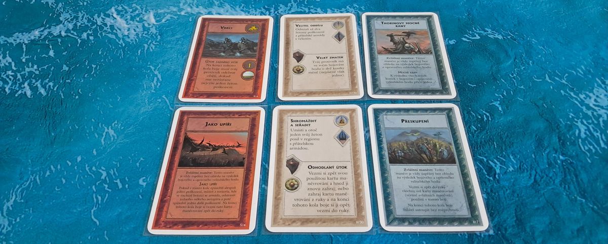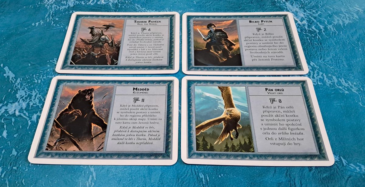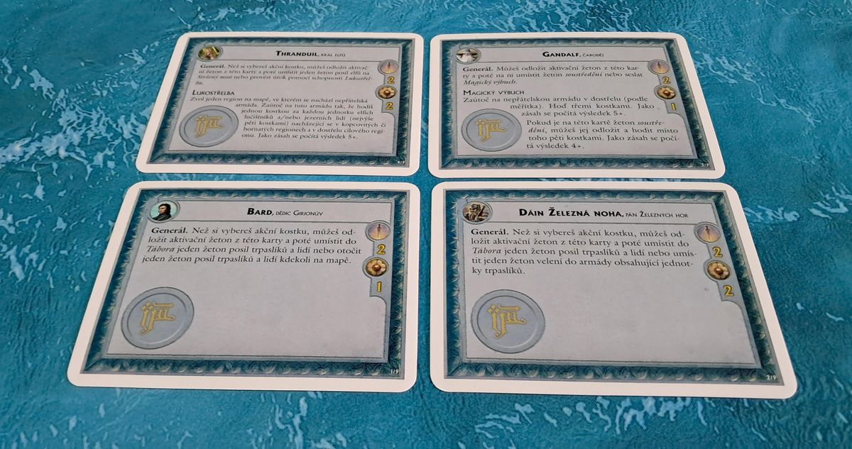 Stín v samém úvodu disponuje celkem šesti kostkami, zatímco Svobodné národy mají pouze pět kousků. Rozdíl tu tím pádem není až tak zásadní jako v případě Války o prsten. Stále však slouží k realizaci akcí. Krom kostek pak mají samozřejmě také karty, jejichž maximální počet je stanoven na šest kousků, po čemž už vám nezbývá nic jiného než se jich ve fázi obnovení zbavit. Zajímavé pak je, že Svobodné národy pracují s generály, kteří vám následně dají vždy tolik žetonů velení, kolik jich máte. Hráč za Stín si vybírá mezi netopýry a žetony velení, načež je součet stejný jako počet akčních kostek, jež má k dispozici, a netopýry lze umístit do libovolného regionu na mapě.