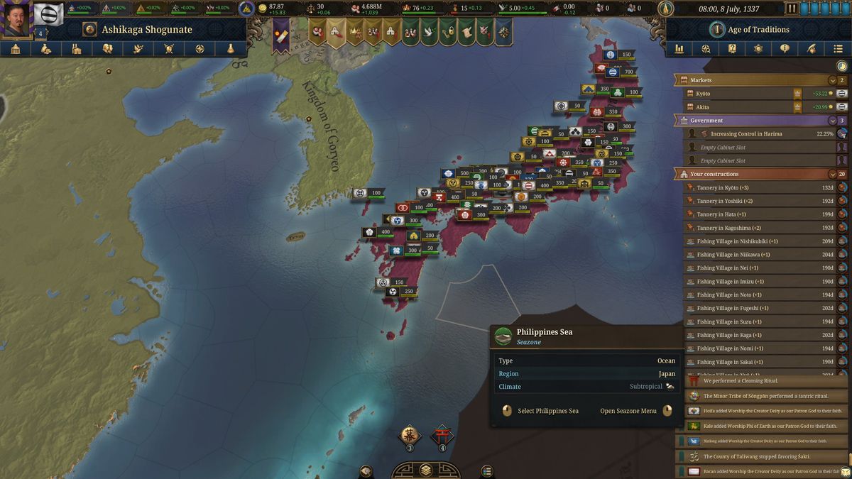 Když pak nebudete válčit, většinou se budete věnovat záležitostem státu. Ten je tvořen řadou vrstev, jež je potřeba optimalizovat ve jménu jeho efektivního fungování, přičemž úplným základem je dělat všechny vrstvy obyvatelstva spokojenými. Jak toho docílíte? Primárně skrze kvalitní zásobení obchodů, jelikož láska prochází žaludkem, a když lid nemá co jíst, rozhodně ho to netěší. Je tudíž třeba mít dobře zásobené obchody a dostatečnou produkci či import zásadních zdrojů. Když totiž na toto rezignujete, je to první krok k pádu. Další vrstvou, s níž je třeba pracovat, je náboženství. V Japonsku to máte třeba jednoduché, v Evropě ale takový klídek nenajdete, takže vám nezbude nic jiného než občas zapálit nějakou tu hranici.