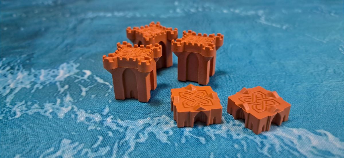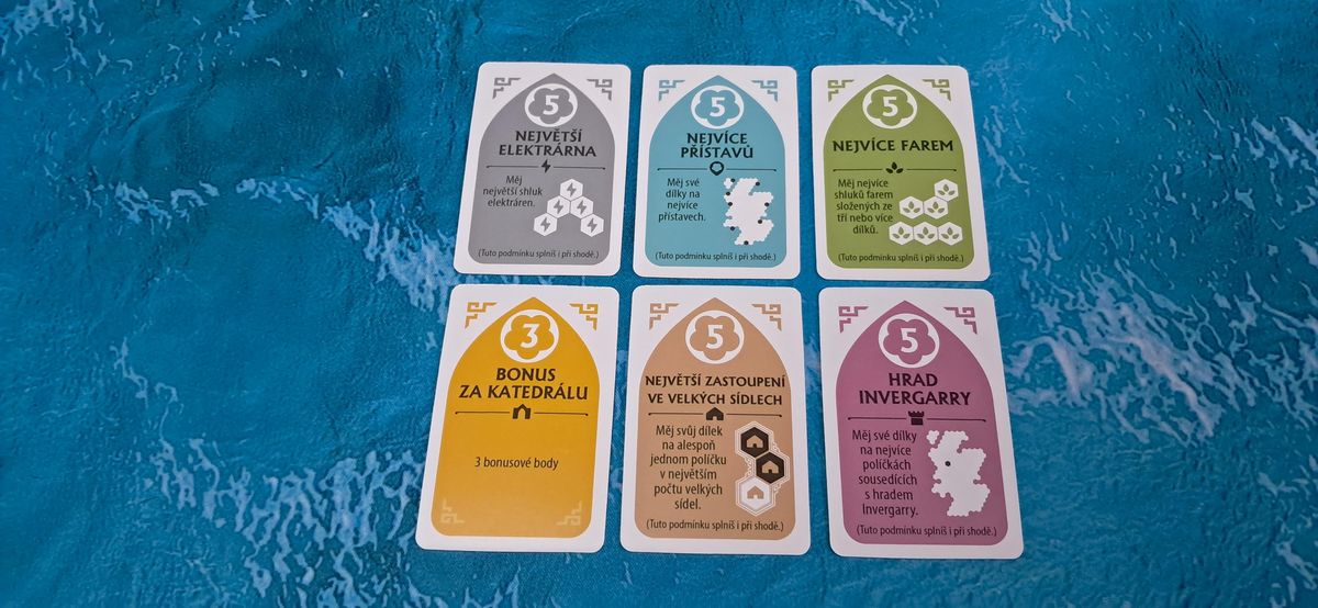 Krom těchto struktur můžete budovat také hrady. Ty stavíte opět na předem definovaných pozicích, přičemž na konci nad nimi má kontrolu ten z hráčů, jemuž se podařilo obsadit co nejvíce prostoru v okolí, takže ten, který bod zabral jako první, na něm svůj hrádek rozhodně nemusí mít v samém finále hry. Vedle hradů jsou tu také katedrály. Když stavíte v jejich okolí, můžete získat karty misí. Ty před vás, podobně jako v Osadnících z Katanu, staví různorodé výzvy, po jejichž splnění můžete počítat s body navíc, což je něco, co na konci partie opravdu chcete. Ve finále pak bodujete počet nedokončených sídel, hrady a samozřejmě také zdárně splněné mise.