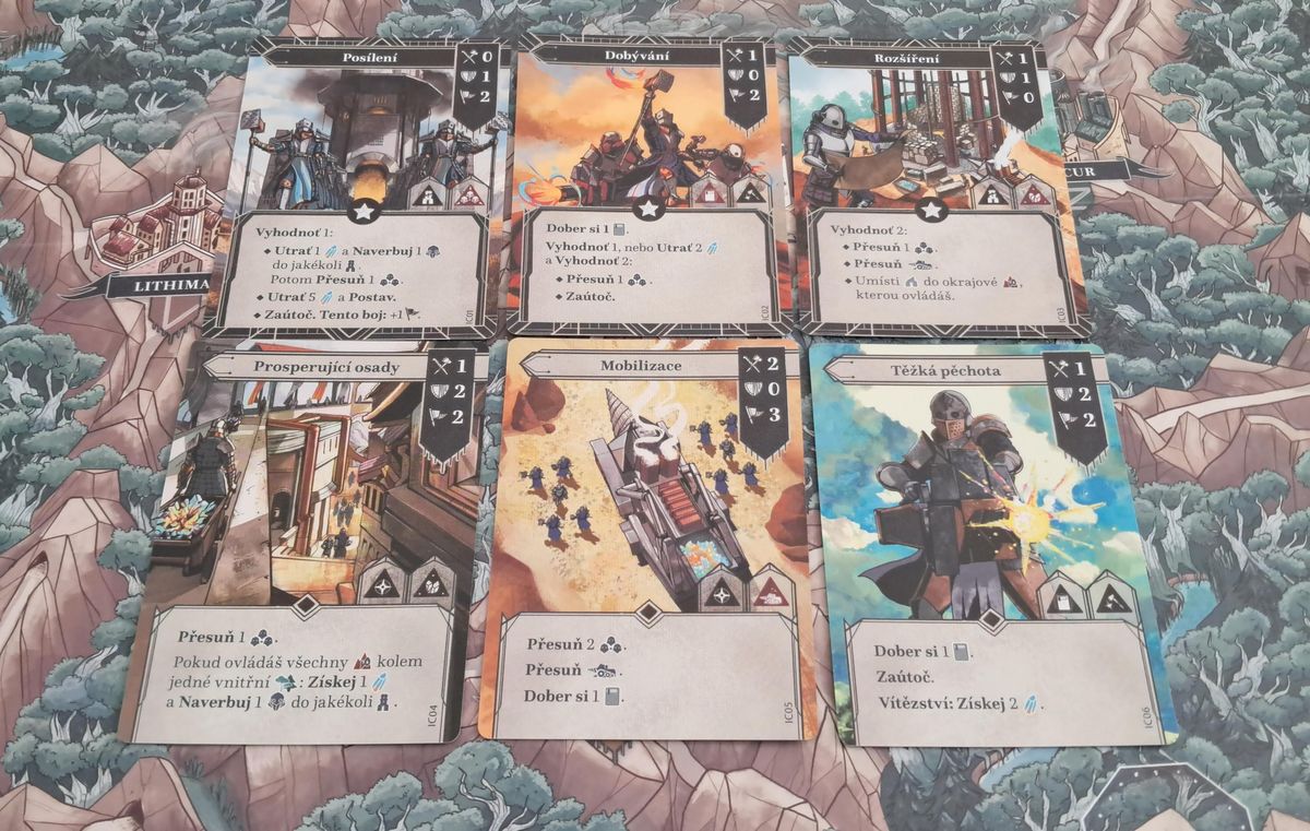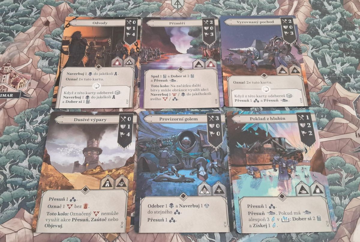 Celá partie se pak hraje na kola, přičemž první je vždy náčelník Strážců hvozdu, zatímco velitel Železného bratrstva je vždy až druhý. Vše startuje fází přípravy, během níž obdrží Strážce jeden krystal, zatímco průmyslově orientovaný velitel dostane dva kusy. Poté si oba hráči doberou dvě vrchní karty ze svého balíčku speciálních karet. Poté musíte zjistit, jak jsou na tom vaše přetrvávající karty, načež je tu fáze akcí. V té se s protivníkem střídáte až do momentu, než každý z vás zahraje 3 karty. Užívat je budete k verbování nových jednotek, dobírání nových karet, přesunu sil po mapě nebo také k eliminaci nepřátelských bojovníků. Někdy to máte zdarma, zatímco jindy vás to stojí krystaly nebo jiné zdroje. Primárně tedy v momentu, kdy chcete potenciál karty využít maximálně.