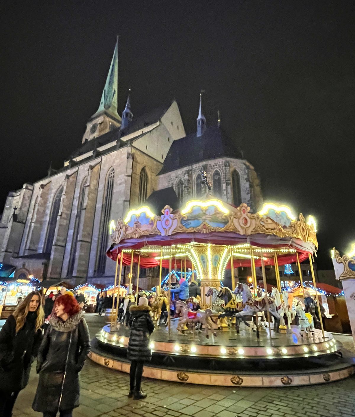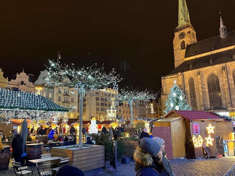 Plzeňská katedrála sv. Bartoloměje s výškou věže 102 metrů je opravdu impozantní stavbou. Pod ní se na poměrně velkém prostoru samotného náměstí Republiky v předvánočním čase nachází 120 stánků, dětský kolotoč a vyhlídkové kolo. Pokud do města piva na trhy vyrazíte, určitě doporučuji buď vystoupat po schodech na vyhlídkový ochoz katedrály, který je ve výšce 62 metrů, nebo zažít jízdu na vyhlídkovém kole, které je sice nižší, ale ušetříte nohy a jako bonus uvidíte nasvícenou katedrálu v celé své kráse.