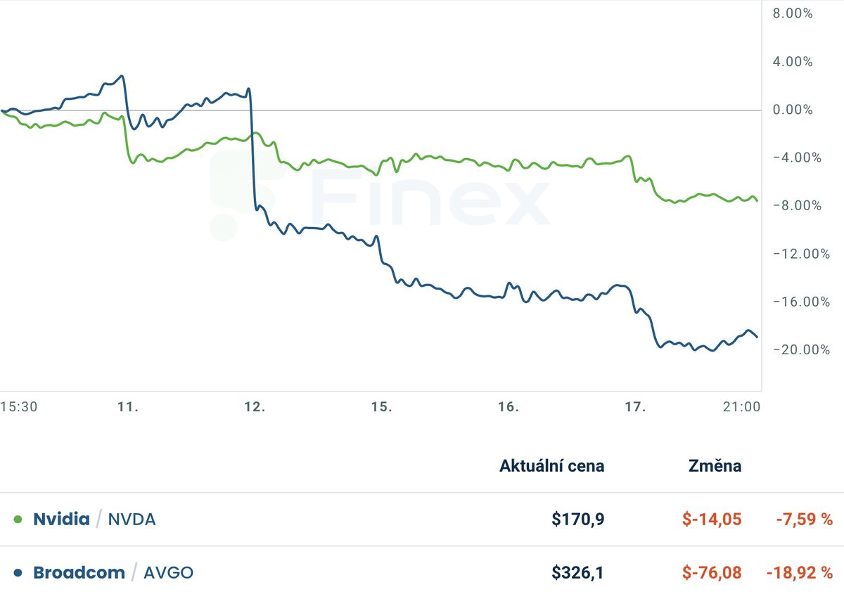 Vývoj ceny akcií Nvidia a Broadcom za poslední týden