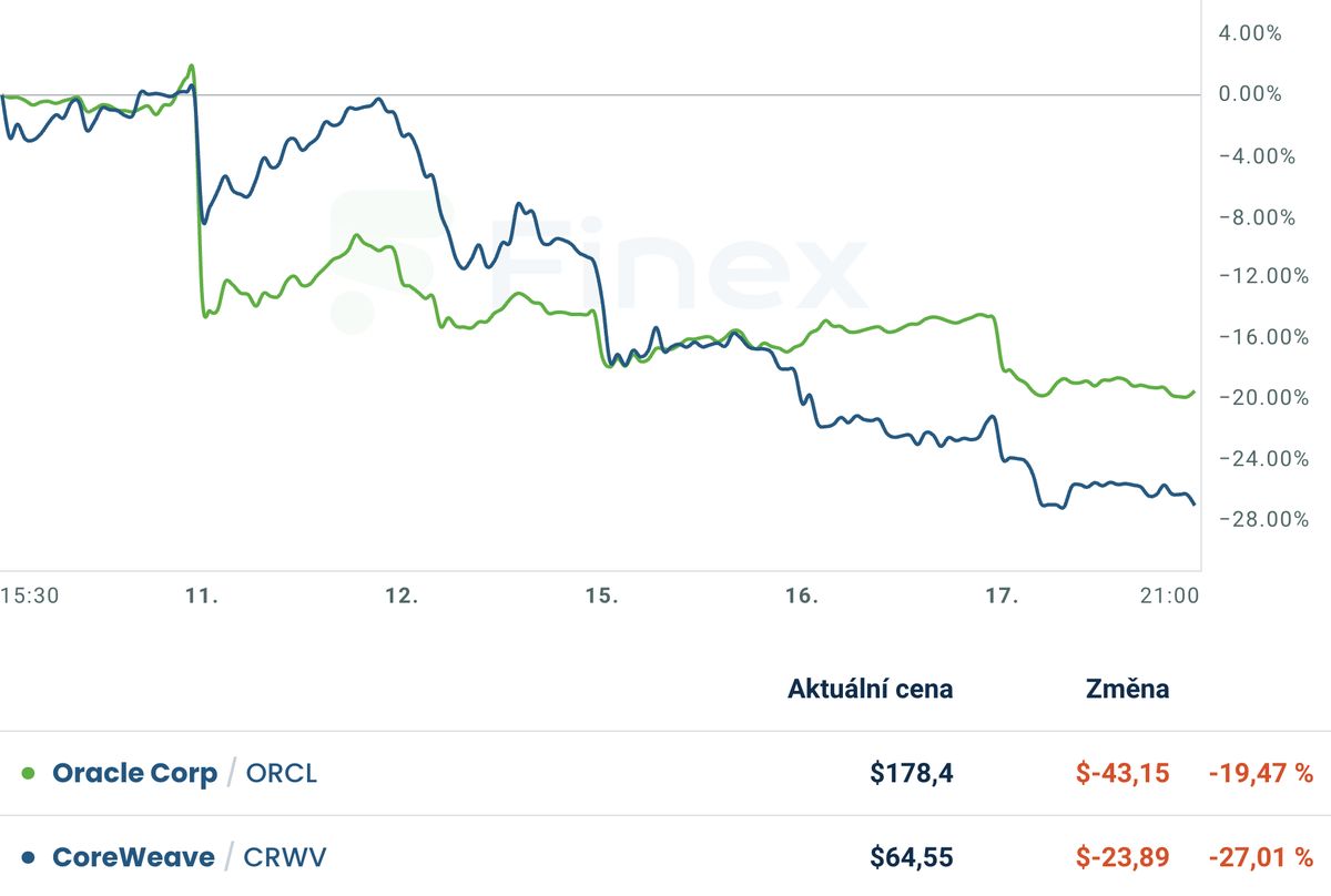 Vývoj ceny akcií Oracle a CoreWeave za poslední týden