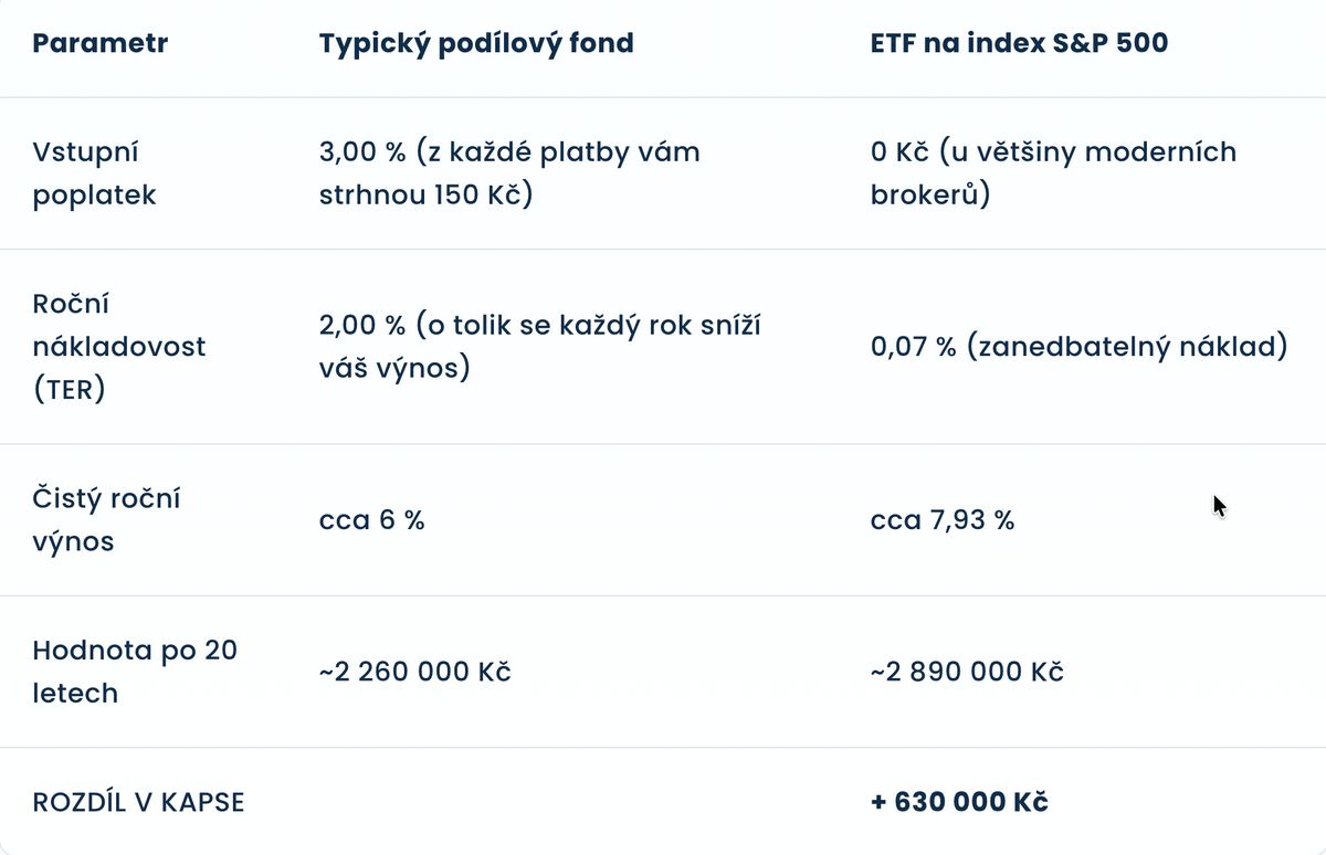 Vliv poplatků na konečnou hodnotu investice - podílový fond vs. ETF