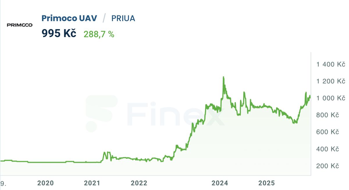 Vývoj ceny akcií Primoco UAV od vstupu na burzu
