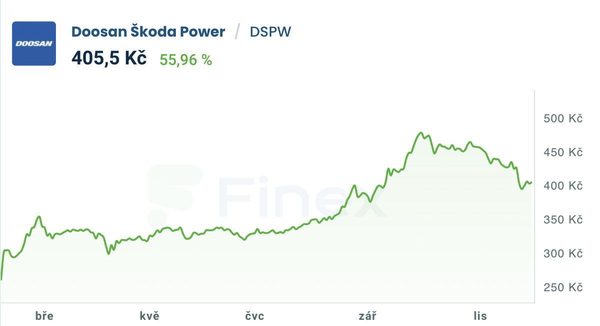 Doosan Škoda Power vstoupila na hlavní trh pražské burzy v únoru 2025 s upisovací cenou 240 korun za akcii a dnes se obchoduje zhruba kolem 400 korun.