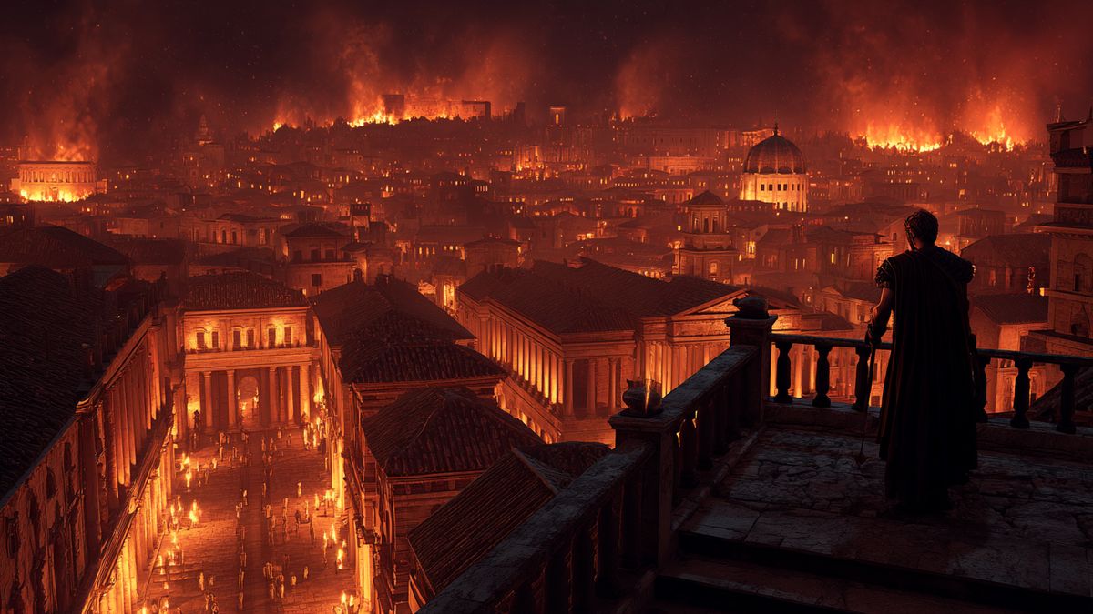 Řím je v plamenech. Lidé utíkají úzkými uličkami, křičí, tlačí se, padají. A někde nahoře, v bezpečí a pohodlí, stojí císař Nero a brnká na housle, zatímco město mizí v ohni. Kruté, cynické, filmové. Přesně ten typ obrazu, který si mozek uloží navždy.