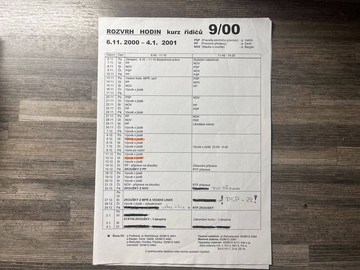 Čtvrt století starý dokument s rozpisem mého základního řidičského kurzu