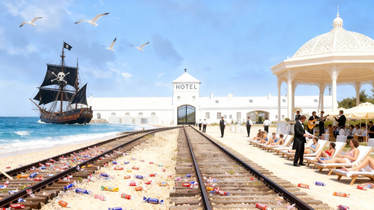 Nakreslila jsem bílý dům, pána i paní, a moře s pirátskou lodí, kterou nese velká kudrnatá vlnka. Taky jsem namalovala lehátka a v nich leží lidé. Do toho ležení jim hraje kapela z altánku. A všude bonbony. Ty tam nesměly chybět. Do kufříku jsem obrázek nedala. Složila jsem ho a dala ho do kapsičky šatiček, aby ho pán dostal hned po příjezdu.