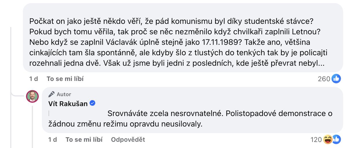 Ale demonstrace to je naše. Ona sice žádná další od roku 1989 nic nezměnila, ale vždycky je hitem. Nejsem jediný, kdo se ptal na význam dalších demonstrací a proč nic nezměnily. Zajímavou odpověď napsal pan ministr vnitra Vít Rakušan na svém facebookové profilu v odpovědi na stejné téma – viz. obrázek.