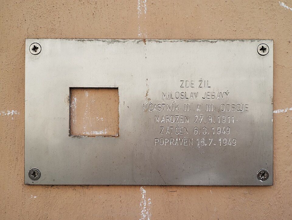 Pamětní deska Miloslavu Jebavému v rámci projektu Poslední adresa na domě v Opletalově ulici 34 v Praze