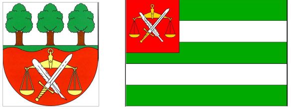 Znak: Ve stříbrno-červeně vlnitě děleném štítě nahoře na zeleném trávníku tři listnaté stromy přirozené barvy, dole zlaté miskové váhy kosmo přeložené stříbrným brkem a šikmo vztyčeným stříbrným mečem se zlatým jílcem. Datum rozhodnutí: 20. 1. 2005