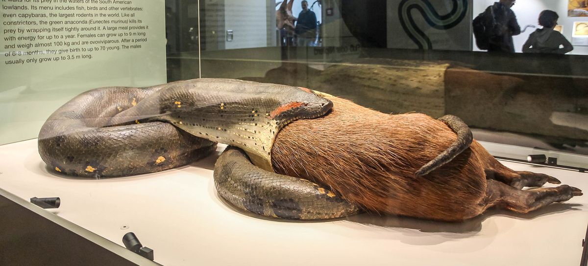 Anakonda požírající kapybaru. Model v muzeu ve Frankfurtu nad Mohanem.