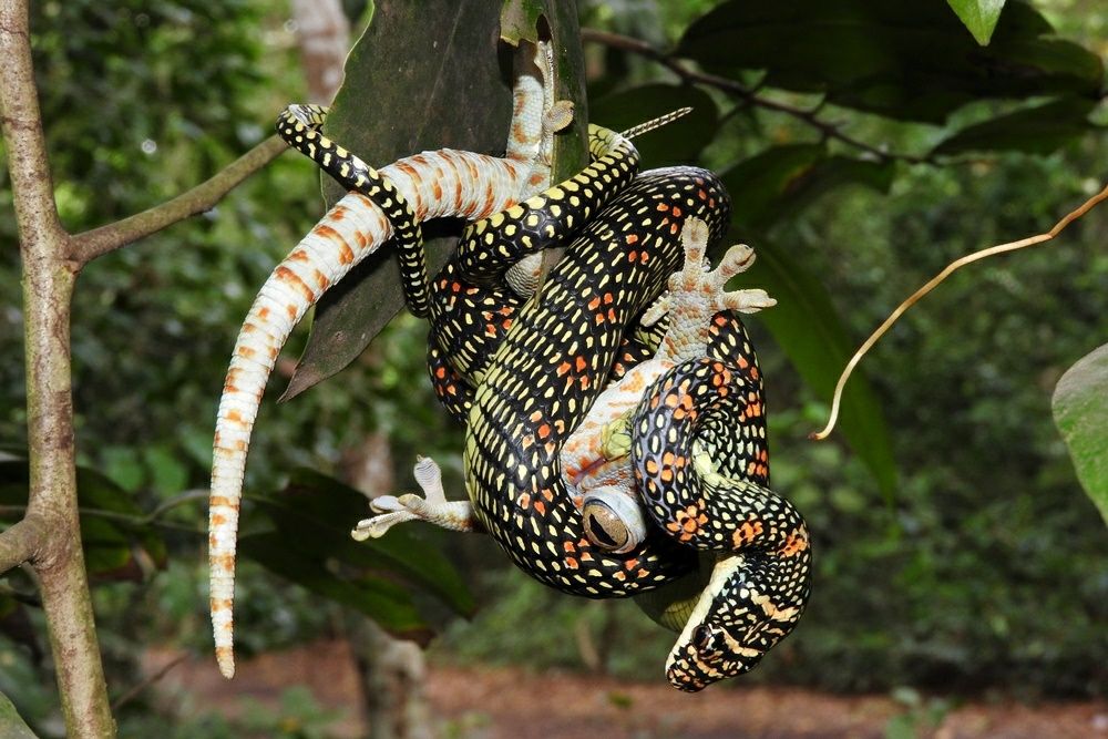 Bojga rajská (Chrysopelea paradisi) s úlovkem.