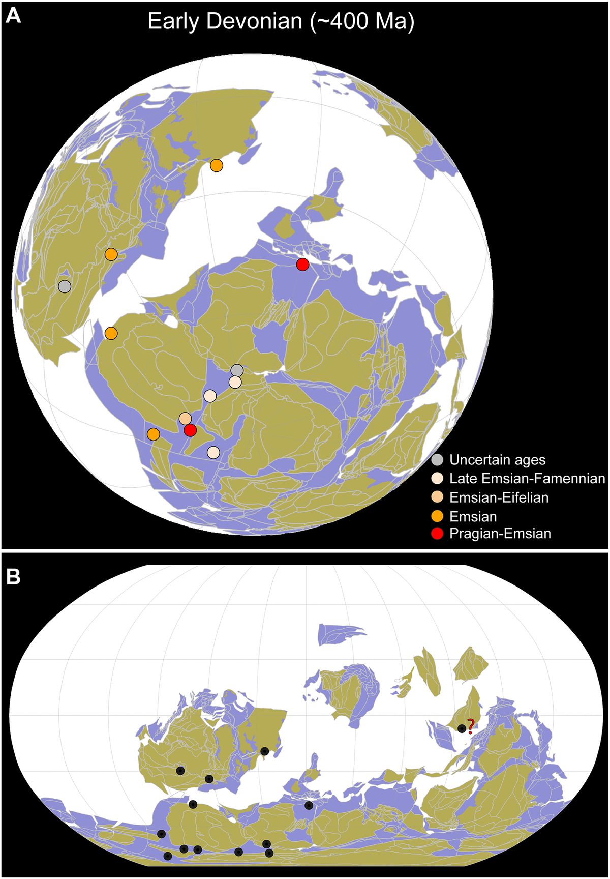 Paleogeografické rozšíření druhu Spongiophyton nanum ve spodním devonu. Barvy na horním obrázku reprezentují stáří vrstev, ve kterých byly nalezeny fosilie, od nejstarších (červená) po nejmladší (světle oranžová). Šedivá znamená nejisté stáří. Na spodním obrázku je totéž, jen bez barev a za použití jiného typu zobrazení.