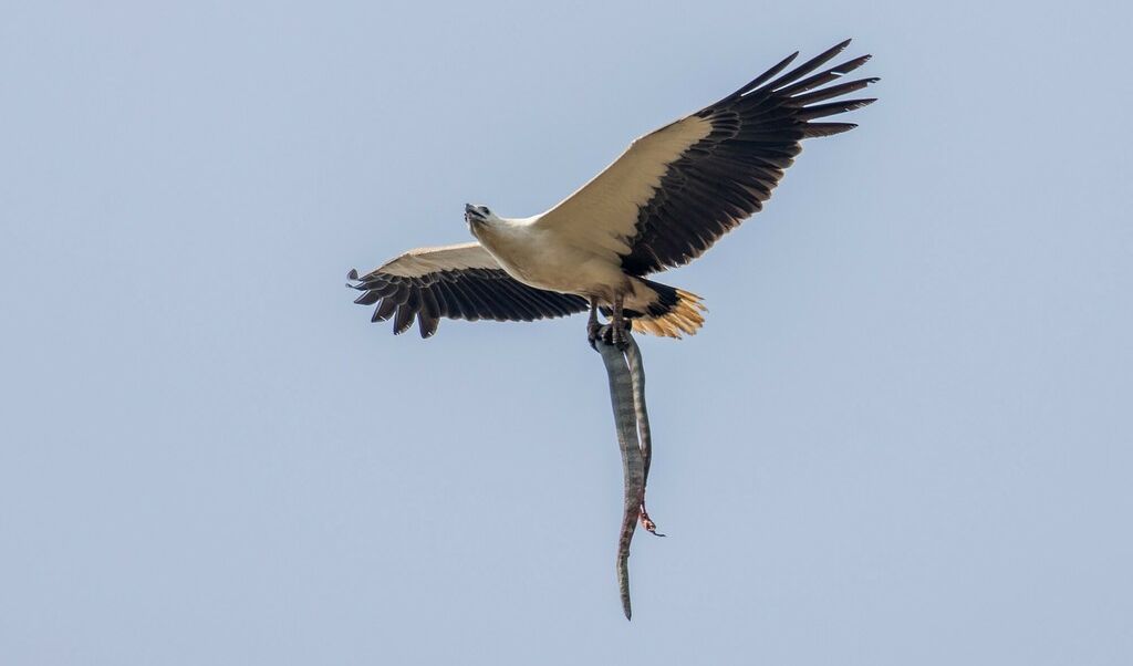 Mořští hadi se občas stanou úlovkem dravých ptáků. Na fotografii pravděpodobně vodnář kobří ve spárech orla bělobřichého.