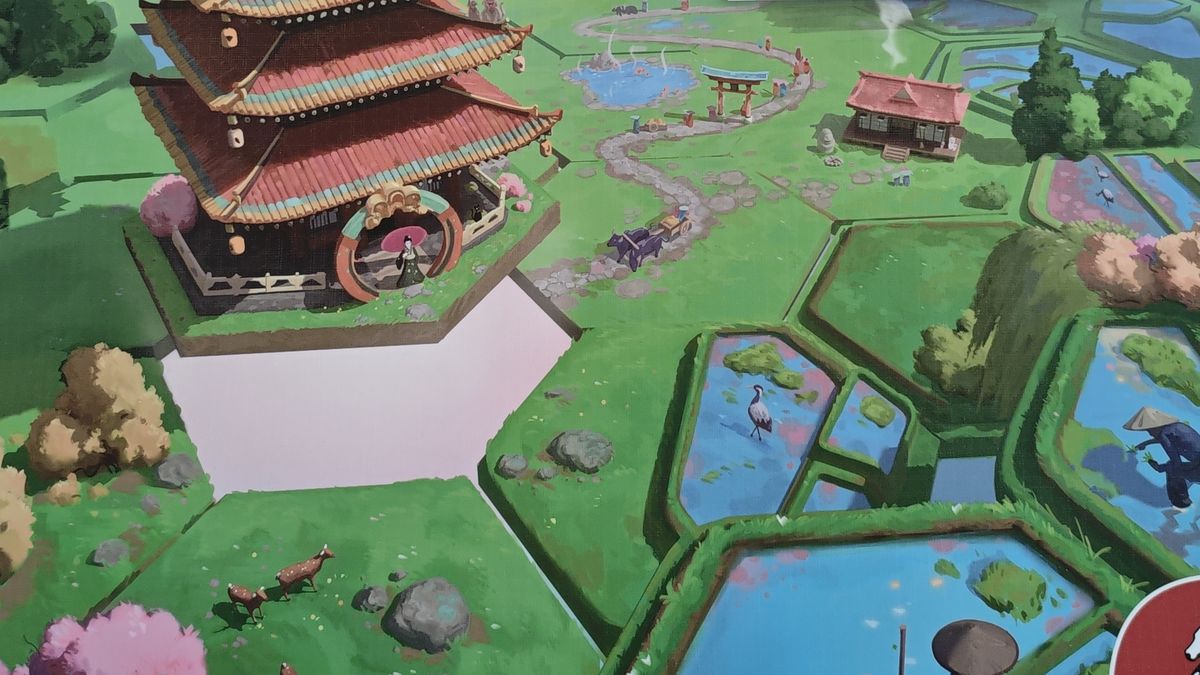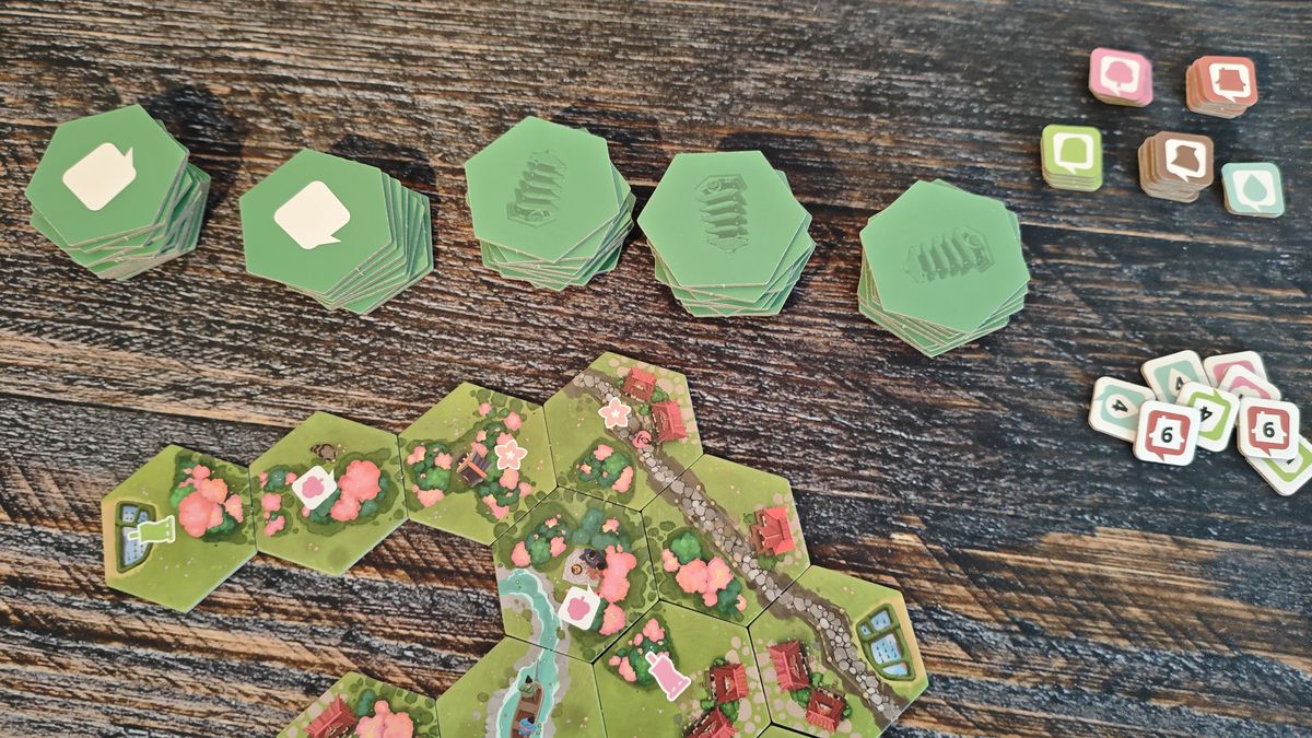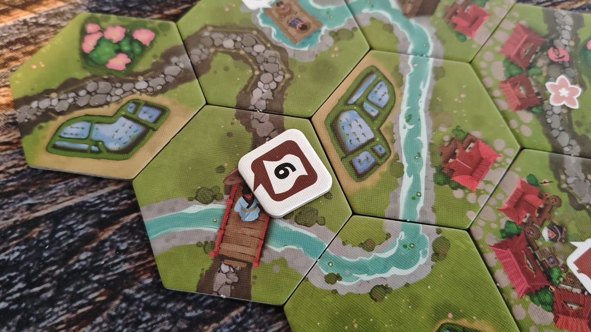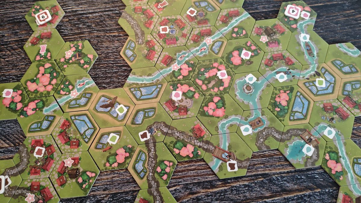 Pravidla jsou velmi přístupná. Na tahu otočíte destičku krajiny nebo úkolu a umístíte ji tak, aby přirozeně navazovala na ostatní. Cesty se propojují s cestami, řeky s řekami a třešňové, rýžové či vesnické oblasti rozšiřujete přesně podle hodnot uvedených na žetonech úkolů.