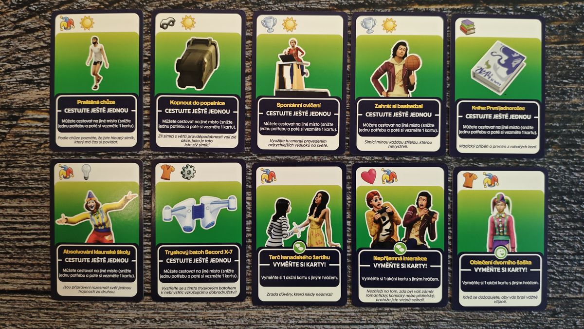 Akční karty představují nejrůznější činnosti typické pro svět The Sims, od práce přes koníčky až po romantiku, a zároveň poskytují symboly potřebné ke splnění aspirací.