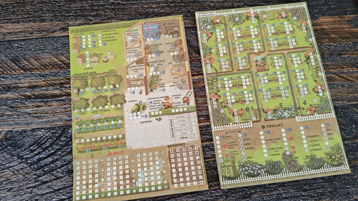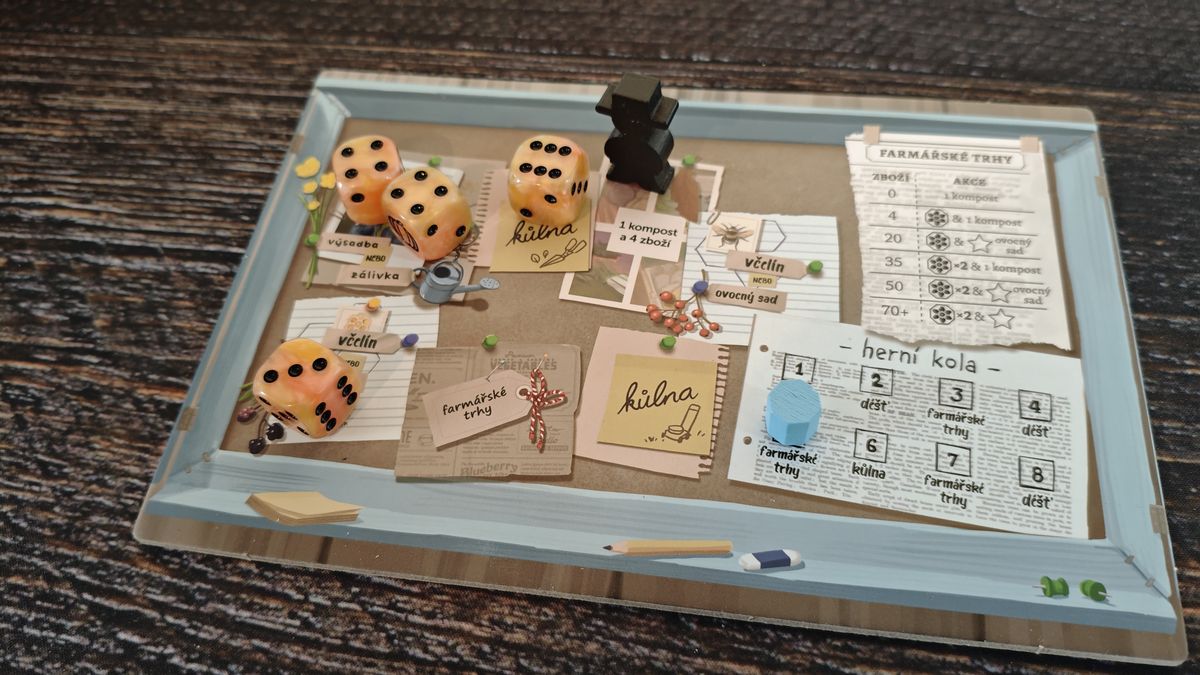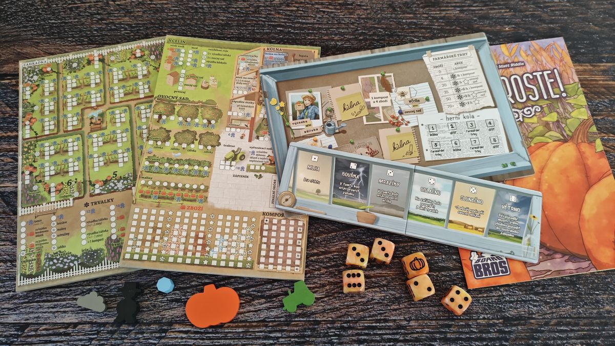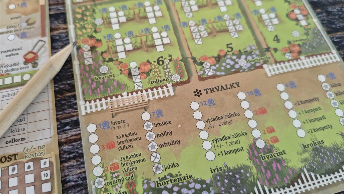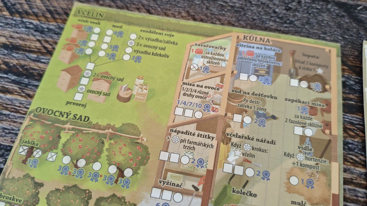 Do toho vstupuje kompost, který upravuje hodnoty kostek a dává hráčům větší kontrolu nad tím, kde a kdy budou jednat. Trvalky přinášejí silné permanentní efekty i bodové ohodnocení, včelín nabízí postupné odemykání dalších sekcí a velmi zajímavé rozhodování o investicích akcí. Ovocný sad je zdrojem bodů, zboží i okamžitých akcí a kůlna funguje jako dlouhodobý engine, který dokáže výrazně ovlivnit závěrečné skóre.