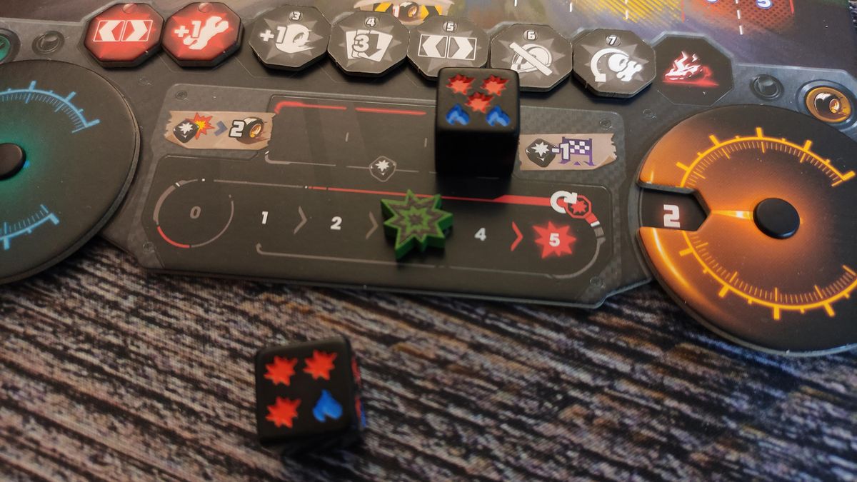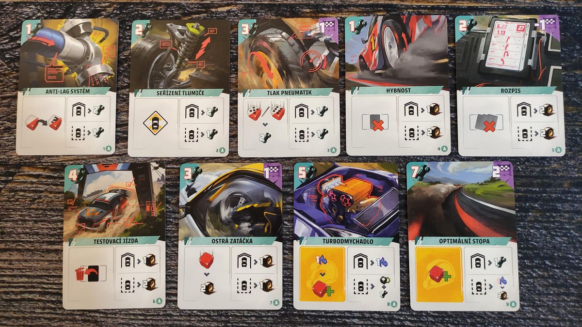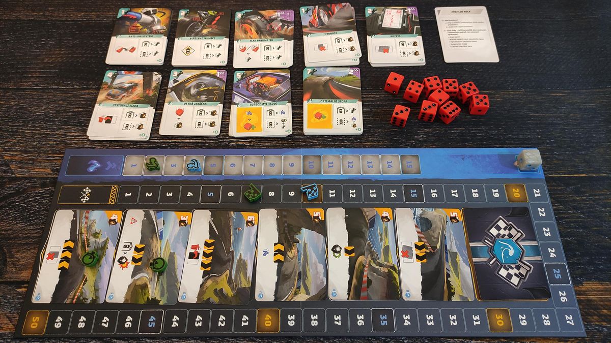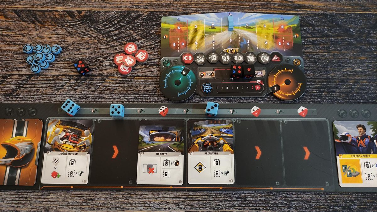 Do šesti slotů hrajete karty, jejichž akce aktivujete spotřebováním kostky. Získáváte tím trakci a klíče, posouváte své auto na trati a otevíráte nové možnosti podle jeho aktuální pozice.