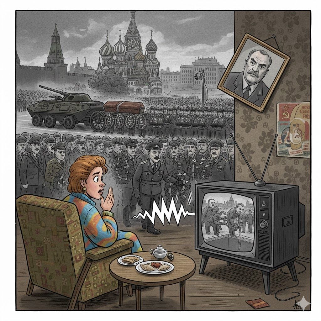Babička: Měl tři díly. První byl pohřeb generálního tajemníka Ústředního výboru Komunistické strany Sovětského svazu a předsedy prezídia Nejvyššího sovětu SSSR Leonida Iljiče Brežněva… Potom skonal Andropov a nakonec i Černěnko.