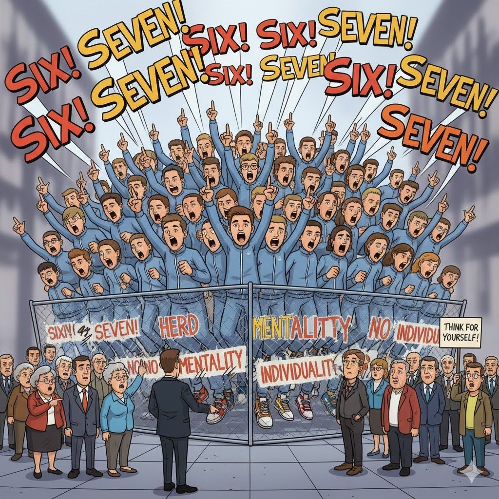 A tady se dostáváme zpět k pořvávání obsahově vyprázdněného „six–seven“, které můžeme pouze v tom lepším případě vnímat jako projev (snad dočasné) demence způsobené nadužíváním digitálních technologií.