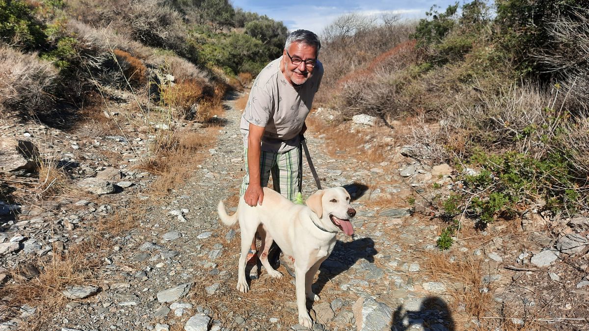 Pak jdeme pár desítek metrů ven do kotců, kde už na procházku nedočkavě čeká Ira, kříženec labradora s něčím. Je to roční fena, takže klasika. Blázínek, navíc neumí žádné povely. První chvíle na vodítku po vyjití z kotce je o utržení ruky, ale pak už je to lepší. Jdeme po kamenité cestě asi kilometr tam a zpět. Odpoledne s ní takto obvykle chodí řecký dobrovolník, já budu odpoledne jen záskok. Přijde mi to výrazně jednodušší než péče o kočky, vyměnit vodu, nasypat krmení, posbírat exkrementy v kotci, procházka, pořádné pohlazení a je to.