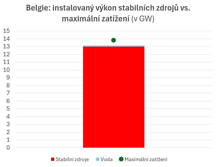 Náš oblíbený „graf pravdy“, který porovnává sumu stabilních zdrojů se zatížením, mluví v belgickém případě jasně: I když přičteme ke stávajícímu mixu tu jednu paroplynku, ani teoreticky to nebude stačit na pokrytí maximálního zatížení…
