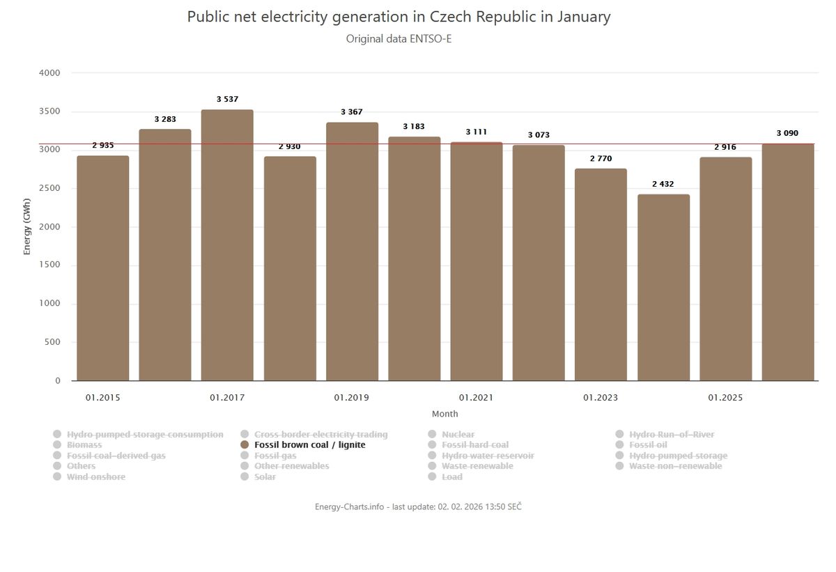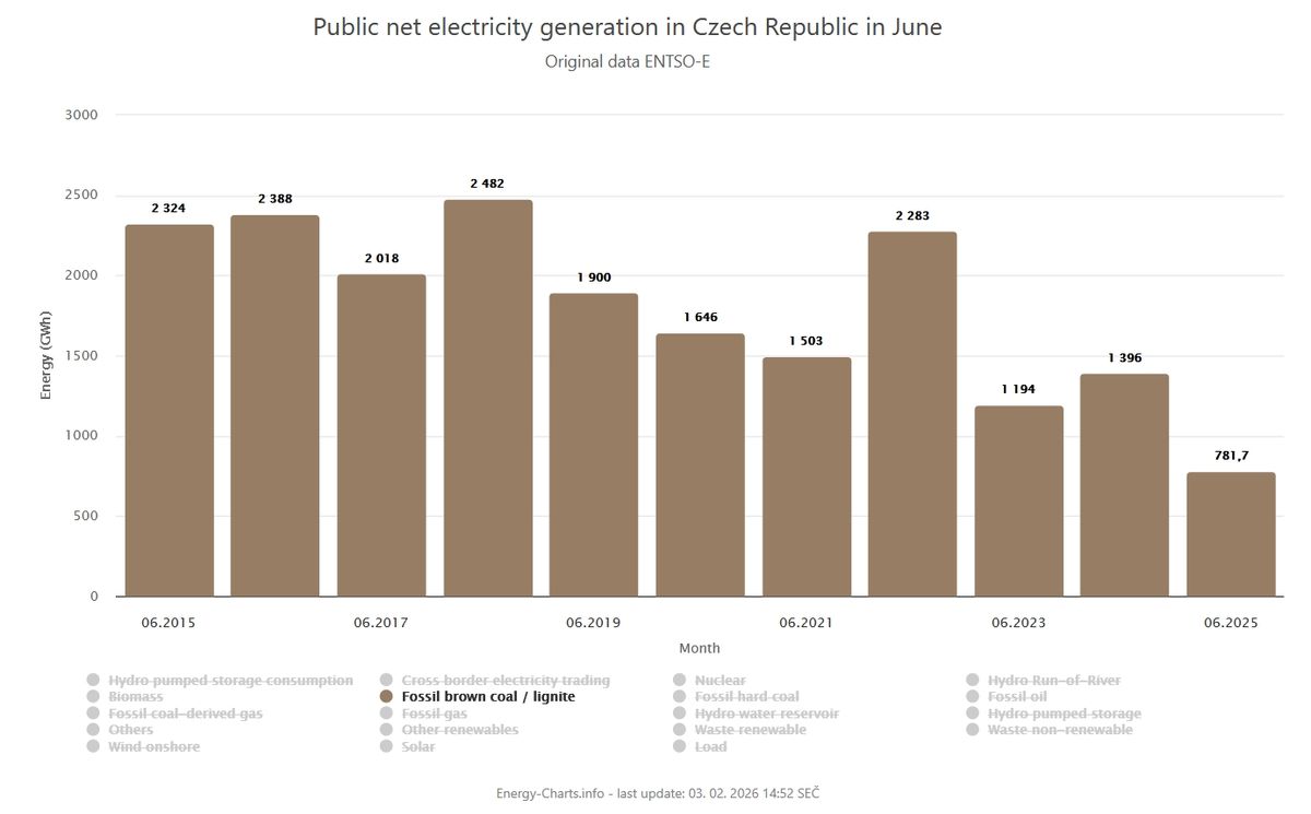 Srovnávat výrobu výhradně za ledny může působit nefér a možná až falešně (kolem projel tleskající Václav Klaus). Když to zkusíme otočit, zjistíme, že třeba loňský červen byl v uhlí suverénně nejslabší v novodobé historii a úplně stejně dopadly za rok 2025 i květen, srpen, září, říjen, listopad, a dokonce i prosinec!