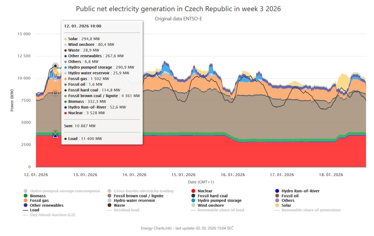 V pondělí 12. ledna 2026 v 10:00 jsme v Česku odebírali historických 11 400 MW netto (já vám říkal, ať to řezání třífázovými cirkulárkami necháte až na víkend…), skoro o 120 MW víc než při dosavadním maximu z 15. února 2021.