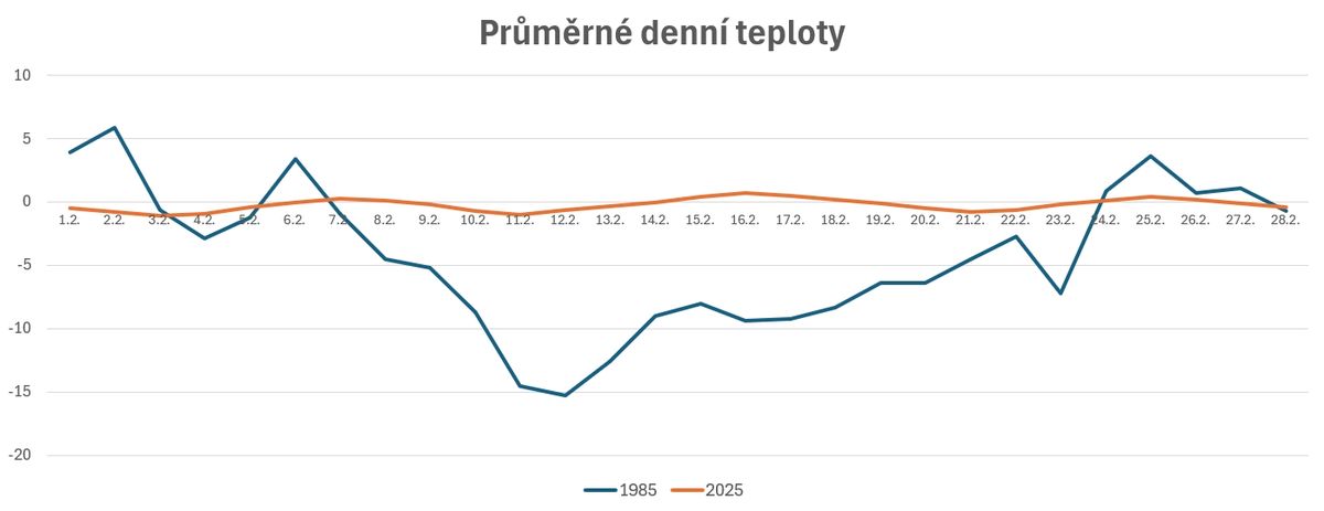 Srovnání teplot v únoru (1985 vs. 2025)