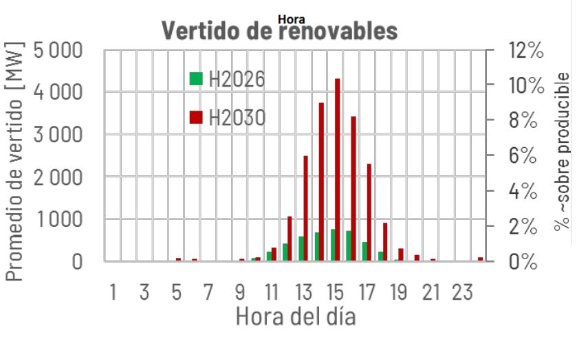 Víte, co je ve španělštině vertido? Dá se to přeložit jako „vypili“, což by naznačovalo, že následující graf zachycuje spotřebu sangrie. Taky to ale znamená „vypuštěný“, z čehož už lze dovodit, že graf ilustruje krácení výroby. Zatímco rok 2026 má být ještě „todo tranqui“, rok 2030 už „un horror“. V peaku přes 4000 MW a přes 10 % zahozené výroby kvůli přetížení sítí…