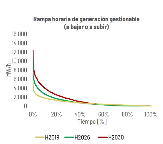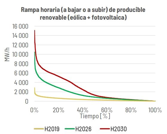 Už před šesti lety si španělští inženýři uvědomovali, že jedním ze strašáků moderní energetiky budou skokové změny výkonu OZE. Copak v roce 2019, to byla ještě pohoda – maximum cca 3000 MW za hodinu. Scénář pro rok 2026 už ovšem počítal s 10 000+ MW/h a scénář pro rok 2030 s cca 15 000 MW/h.