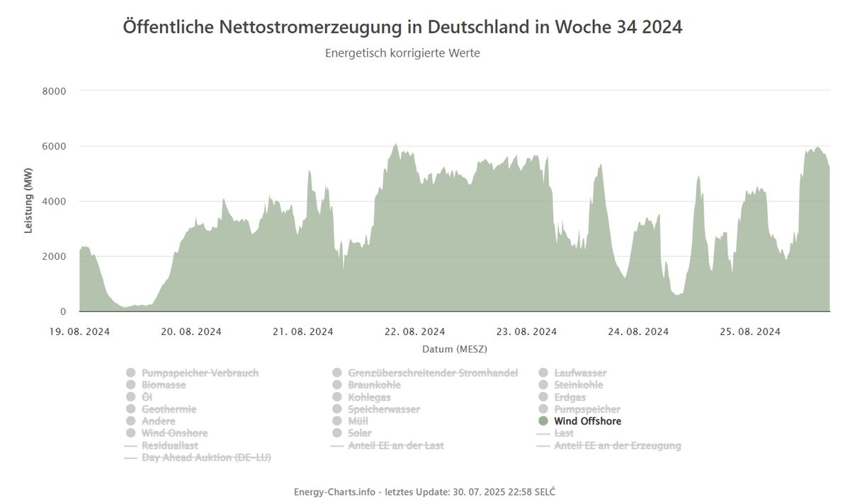 Klika, že v pondělí 19. srpna 2024 ráno skoro nefoukalo, že? Před osmou dodávaly německé offshory do sítě jen něco málo přes 300 MW a jejich výkonové minimum v době „harmonického koncertu“ činilo 130 MW. Zjednodušeně řečeno tedy vypadly kabely, kterými v tu chvíli skoro nic neteklo. Kdyby vypadly o den dva později, mohl se incident dostat na mnohem exponovanější místa než na stranu 120 Systemstabilitätsbericht 2025.