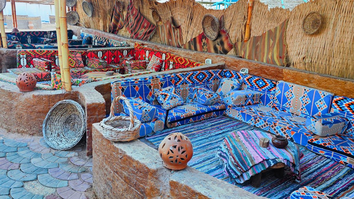 Moře je klidné, jeho zvuky jsou příjemně tiché – slyším jen jemné šplouchání vln o břeh, které vytváří uklidňující melodii. Míjím slavné „pelešárny“, jak se běžně říká těmto nízkým sedacím plochám pokrytým barevnými polštáři a koberci, které hýří všemi barvami duhy – červenou, modrou, zelenou, žlutou, oranžovou. Tyto pelešárny budou za pár hodin plné turistů, kteří si objednají čaj, kávu nebo vodní dýmku a budou zde trávit hodiny pozorováním moře a lidí procházejících po promenádě.