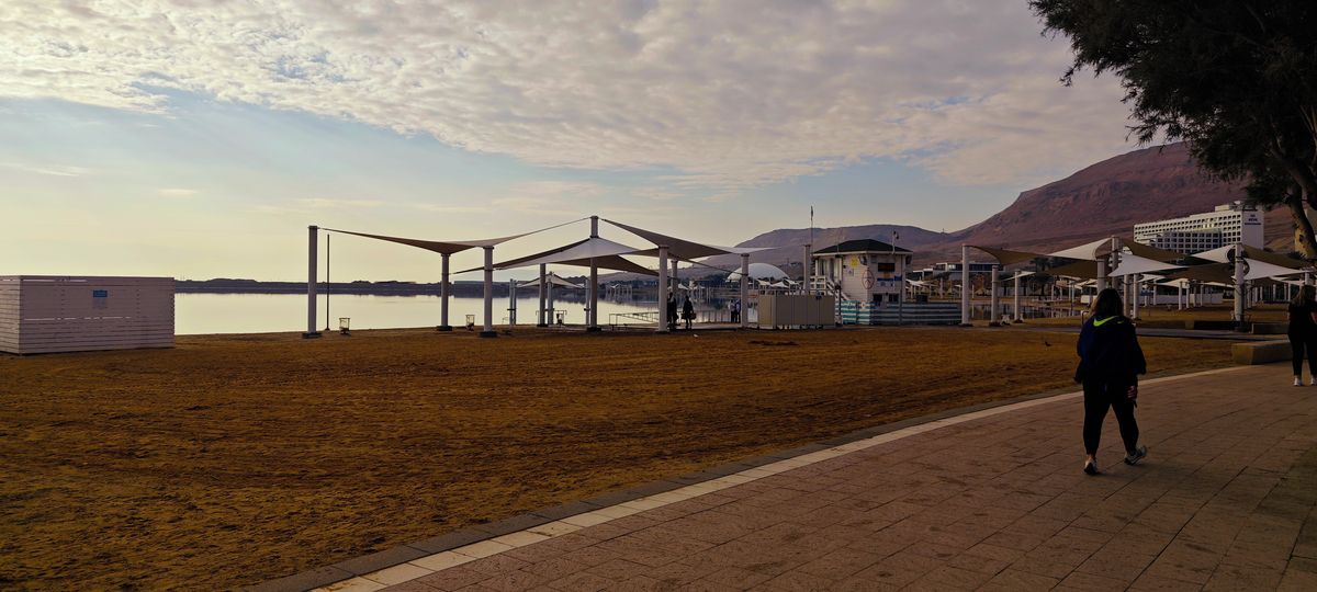 Je půl osmé ráno. Mám na sobě zimní bundu a představa, že za chvíli budu v plavkách, mi připadá legrační. Nejprve si ale dáváme ranní kávu v právě otevřeném obchodě s kosmetikou, jak jinak než z Mrtvého moře. Majitelé otevřeli evidentně jen kvůli nám – okolí ještě spí.