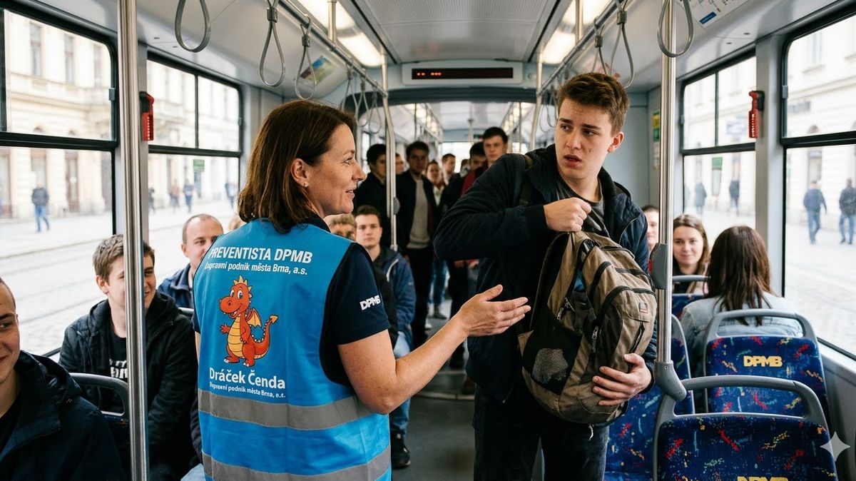 Od tohoto týdne se v tramvajích, trolejbusech a autobusech brněnského dopravního podniku objevila nová, nepřehlédnutelná posila. Tým deseti preventistů v nápadných modrých vestách s roztomilým červeným dráčkem Čendou na zádech prochází vozy a s železnou vlídností upozorňuje cestující na jejich prohřešky.