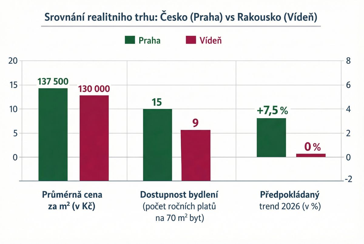V roce 2026 stojí průměrný byt v Praze kolem 115 000 Kč za metr čtvereční. Ve Vídni? Prakticky stejně – zhruba 110 000–150 000 Kč/m². Na první pohled srovnatelné ceny. Problém je v tom, co se skrývá pod povrchem.