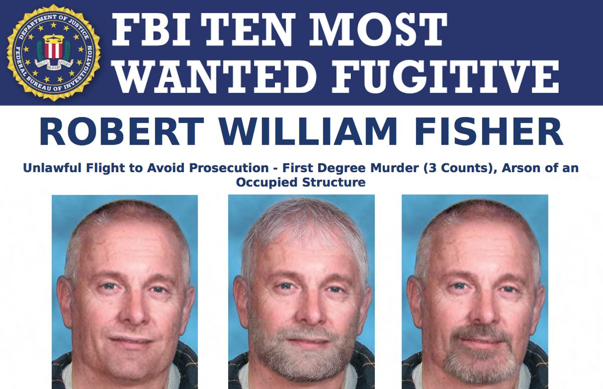 FBI, původní plakát s nápisem hledaná osoba FBI spolu s kompozitními snímky vytvořenými FBI, které ukazují, jak se Fisher může pokusit maskovat.
