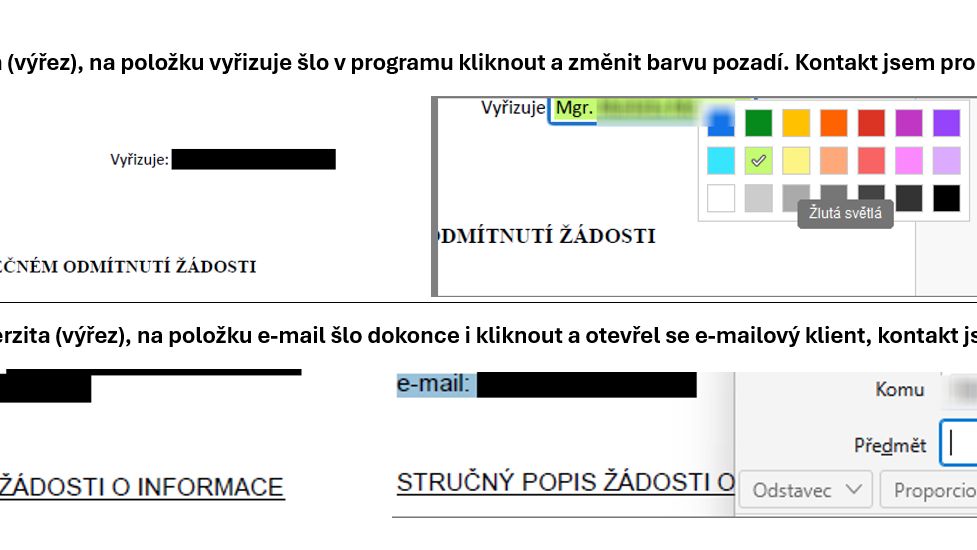 - Dvě univerzity – v obou případech šlo o poskytování informací podle zákona č. 106/1999 Sb., kde takto byla provedena „anonymizace“ v PDF souborech.