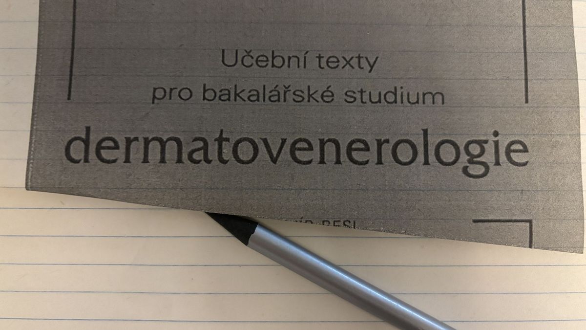 3. Titulní koláž: papír, tužka a část obálky knihy RESL, Vladimír. Dermatovenerologie: učební texty pro bakalářské studium. Praha: Karolinum, 1997. ISBN 80-7184-395-4.
