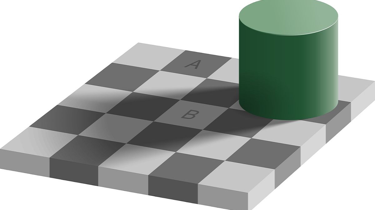 Přesně to ukazuje šachovnice záhlaví článku. Políčko B není světlejší než A. Ale v kontextu stínu válce mozek říká: je světlejší. Vnímání je vždy relativní k okolí, ne absolutní. A rozum se s tím pere.