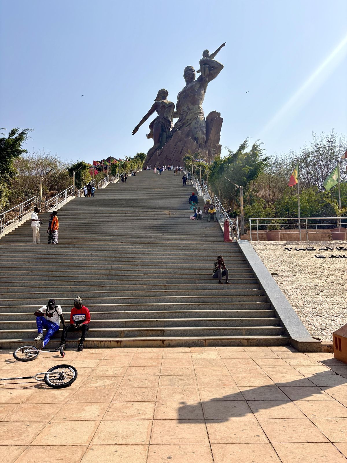 Po návratu do Dakaru musíme ještě na jedno místo. Prohlédnout si tu neuvěřitelně velkou sochu, která symbolizuje znovuzrození Afriky. Je až absurdně velká. Vždycky mi hlavou proběhne myšlenka „tak na tohle tu peníze jsou“. Kolem prodejci nabízí své suvenýry a ani my dnes neodoláme.