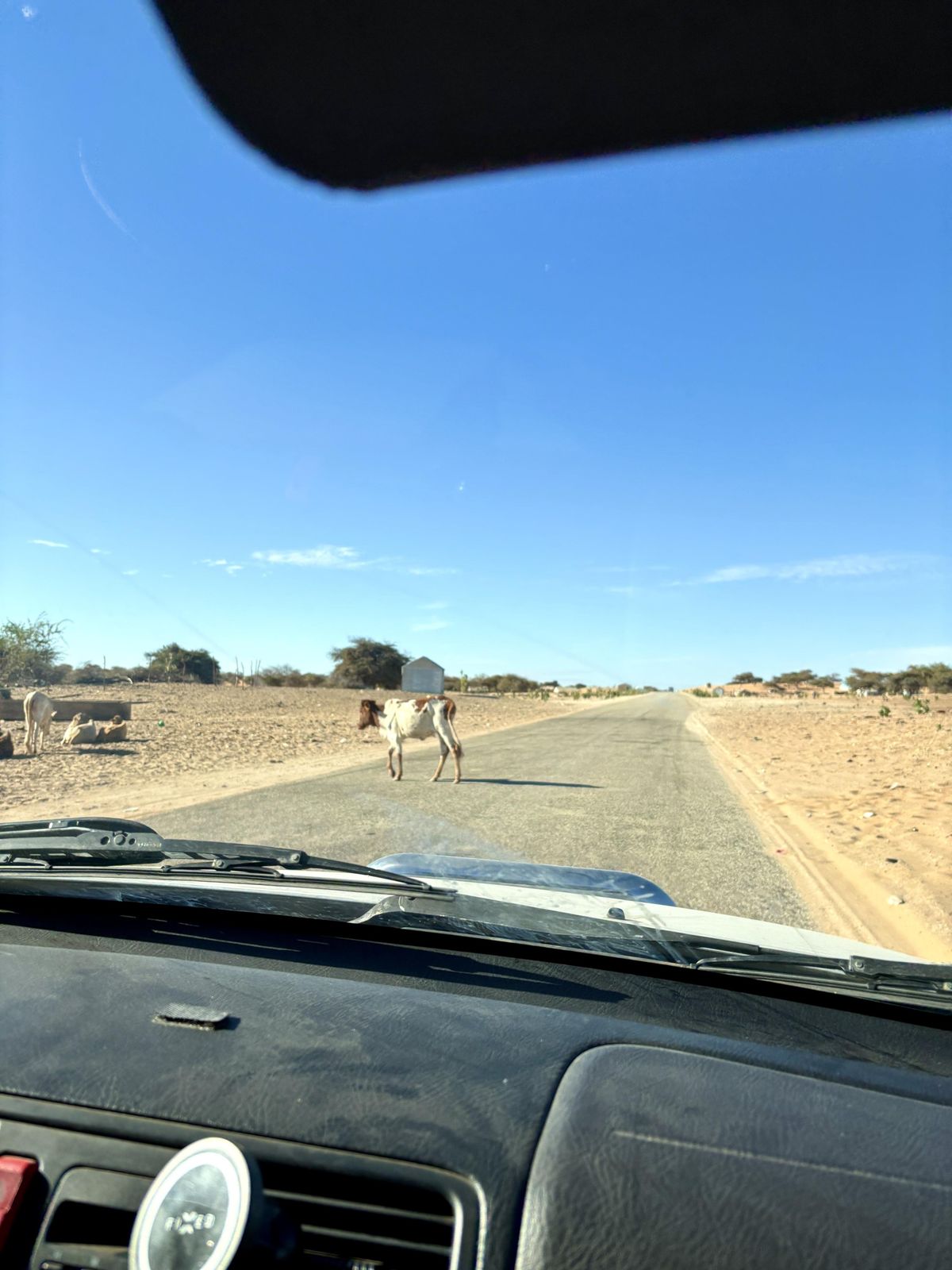 Je to tady, vyrážíme na cestu, Dakar volá. Teda hlavně celní správa, kam musíme pro razítko pro naše autíčko. Čeká nás asi 4.5 hodinová cesta. Kolem ní se objevují vesničky, stáda krav, která se pasou, dokonce jsme už viděli i domácí prasátka.