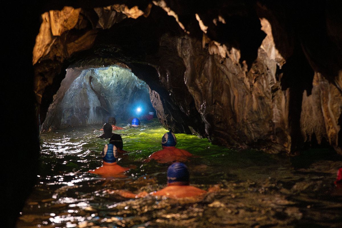 Na pokyn Michala Moravce se z lodí pomalu spouštíme do řeky. Každý pohyb má svůj význam, žádná zbrklost. Voda tě přijme, když se k ní chováš s respektem. A pak už jen kloužeš dopředu — metr po metru, tón po tónu — dokud se tma nerozestoupí a nezahlédneš světlo u ústí.