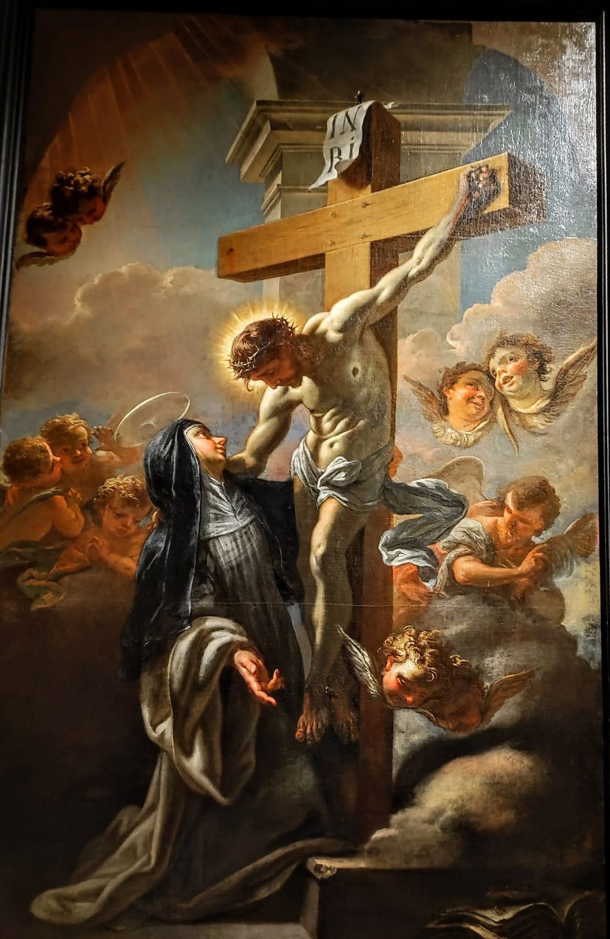 Kristus není ikonou, ale tělem – těžkým, poraněným, pozemským. Řeholnice se dívá vzhůru jako člověk k člověku. Jádrem obrazu je dotek: okamžik, kdy lidská ruka hledá božskou odpověď.