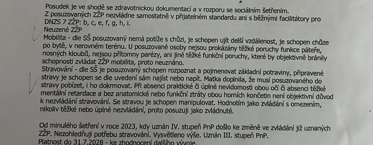 Když jsme v roce 2021 řešili příspěvek na péči pro našeho syna poprvé, měl uznanou potřebu stravování. U předchozího znovuposouzení také. Posudkový lékař vzal na vědomí zprávy od specialistů, které popisovaly, že kvůli svému postižení potřebuje pomoc při jídle. Letos však přišla ledová sprcha. Najednou stravování uznáno nebylo. Posudkový lékař napsal: „Syn není slepý, má ruce, není po amputaci horních končetin.“ Jako by existence rukou znamenala automaticky schopnost zvládnout jídlo bez asistence. Realita? Syn měl ruce vždy, slepý nebyl ani dříve. Stejný stav, naopak došlo ke zhoršení diagnóz a nasazení medikace, ale jiné rozhodnutí.